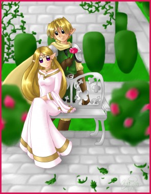 Here, Princess Zelda is in a simpler outfit and is (in a way) flirting with Link (who is now a knight) in the Hyrule Castle Gardens
