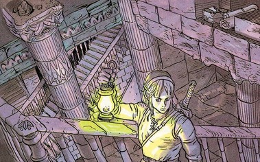Sources: Scanned and contributed by Daniela, from the Official Link's Awakening German Player's Guide! Notes: A beautiful image of Link warily walking up some steps with a lantern. Done in the same style as the Japanese art also in the US players guides. I'm happy to see there is so much more out there.