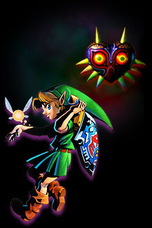 Link drawing his sword, with Tatl and Majora's Mask overhead.