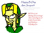 abday.PNGHappy B-Day Ami!373 viewsI'm a terrible person, I forgot Ami's birthday! I didn't mean to! Well, um, Link looks sadistic. I think he's going to hurt me for forgetting, or go and throw a rotten tomato at the next door neighbor girl, who concidently is named Susie...